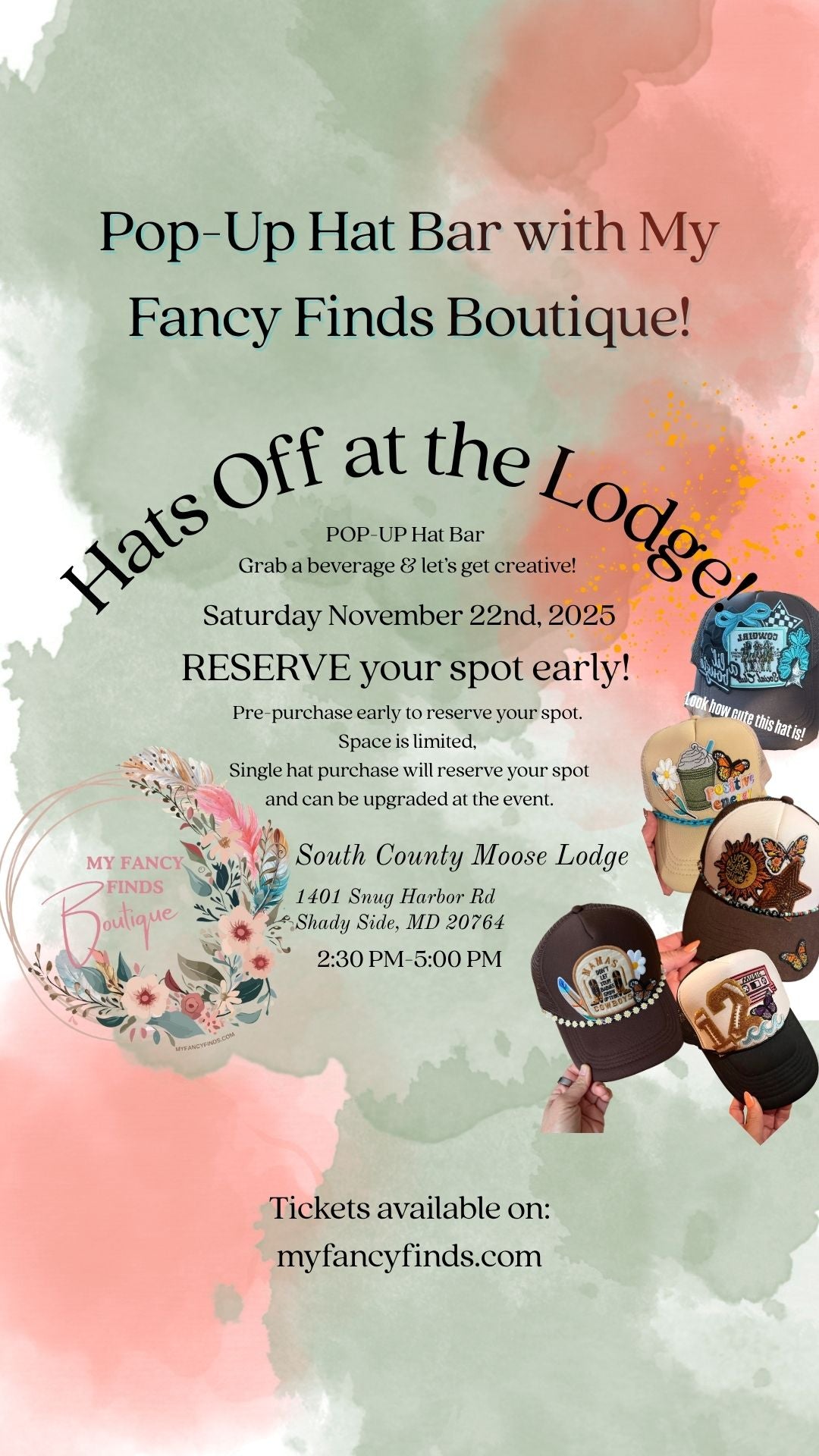 Pop up Hat Party – Grab something to sip on & lets get creative! - Saturday, November 22nd, 2025 from 2:30PM - 5PM. 1401 Snug Harbor Rd. Shady Side, MD 20764
