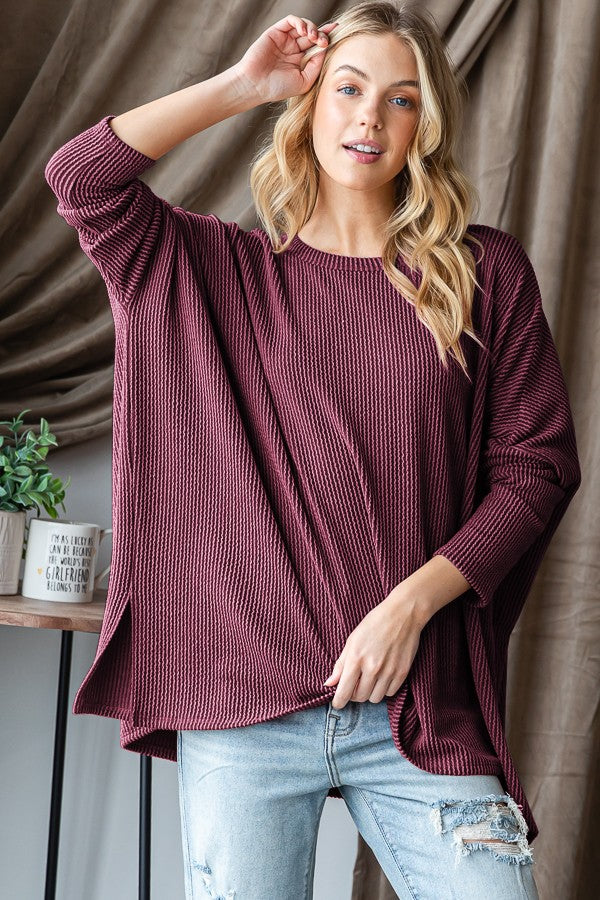 With long sleeves and an urban ribbed material, this trendy top is perfect for a laid-back, yet stylish look. The unique burgundy color adds a touch of sophistication to this comfortable top. (So trendy, you'll be the envy of the neighborhood!)