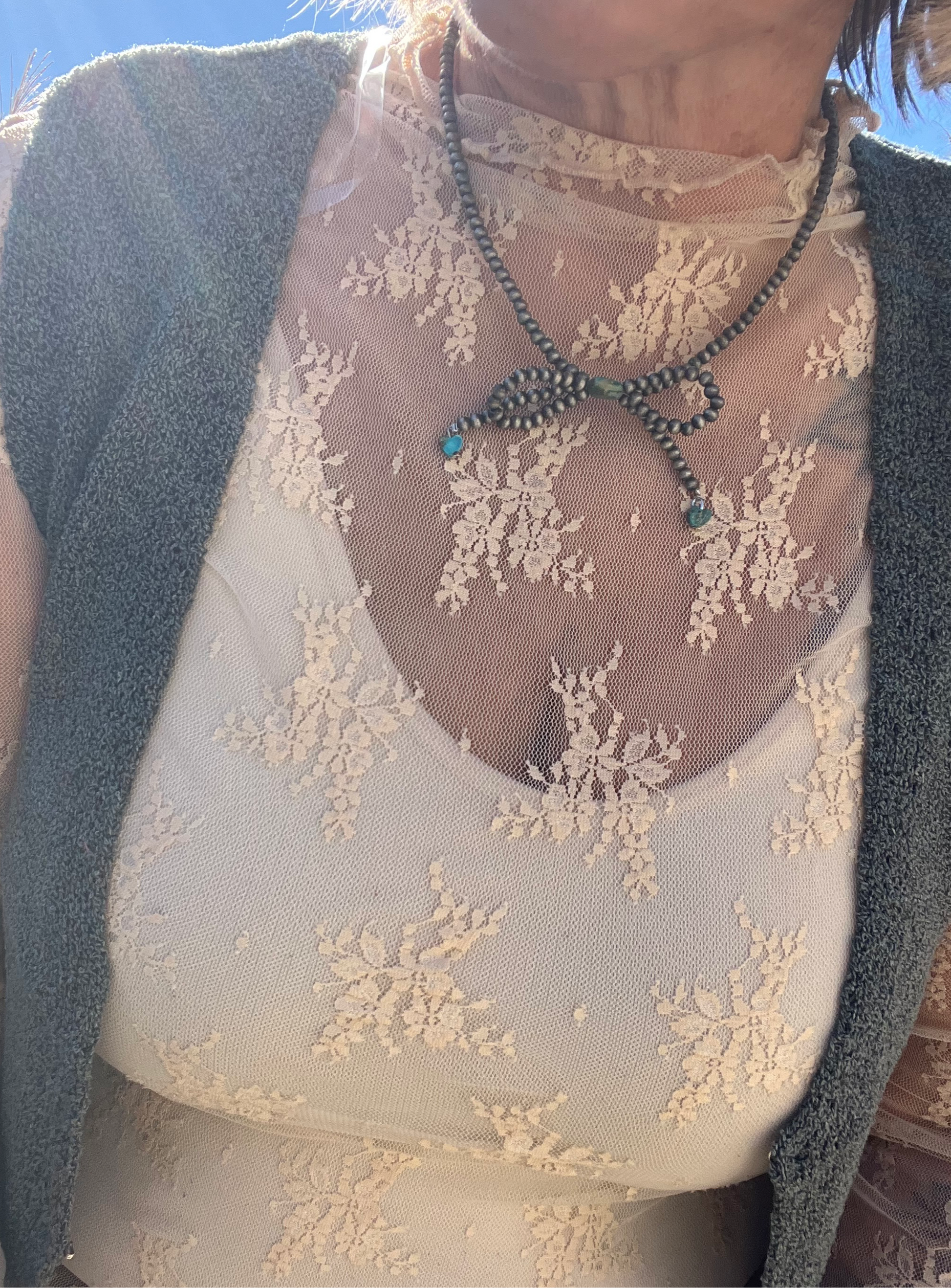 This handmade choker features cowgirl pearls, faux Navajo pearls, and a playful bow made of small beads. With an extender chain and unique gemstones, this 15" necklace (plus 5" extender) is perfect for any quirky cowgirl. (Yeehaw!)