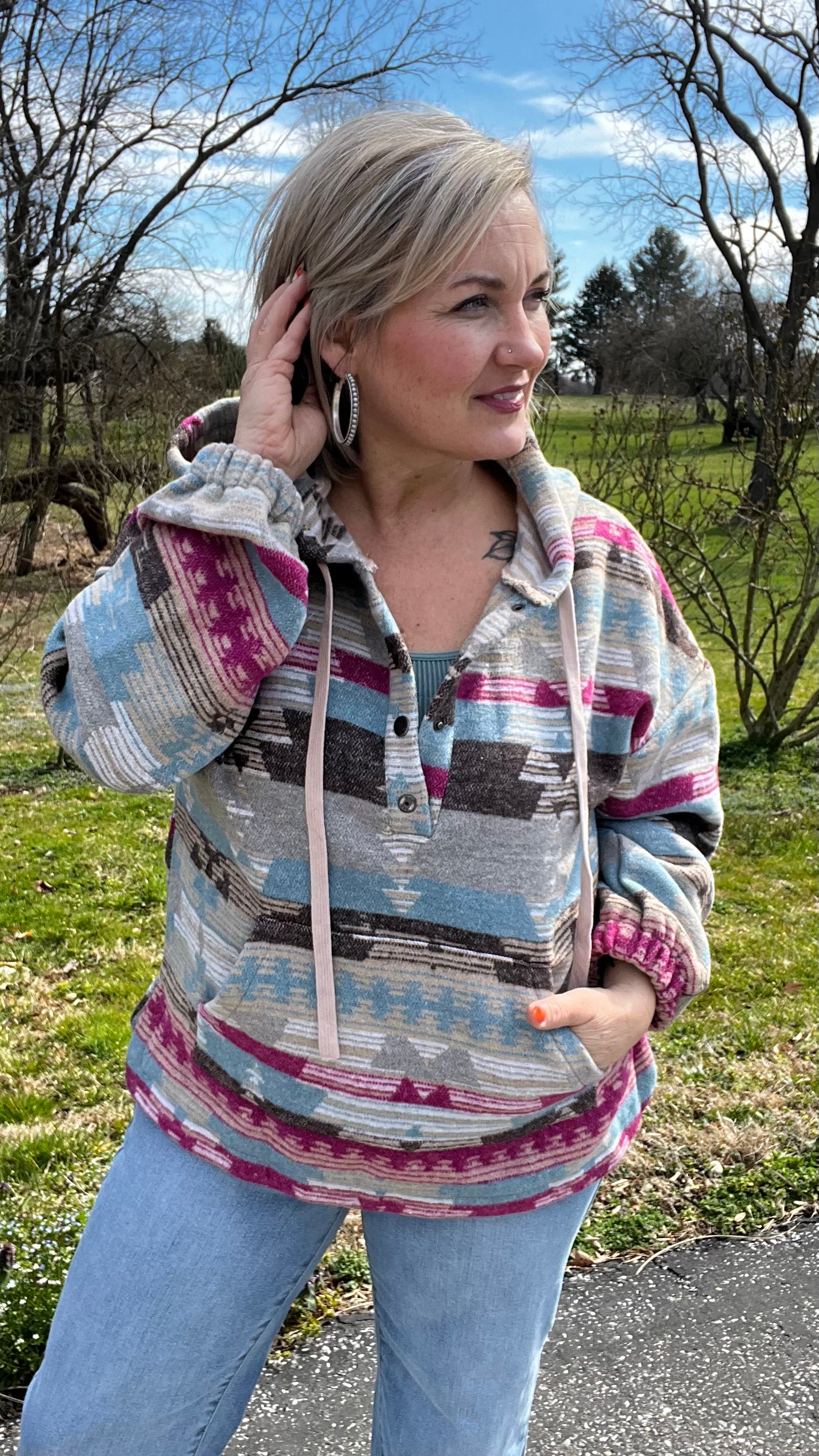 Get ready to add some fun to your wardrobe with our dusty blue Aztec pullover! This pullover not only features an eye-catching Aztec print, but also a convenient snap front closure, cozy hoodie, and kangaroo pocket. The side slit adds a touch of style to this perfect piece for beach bonfires or campfire cuddles.