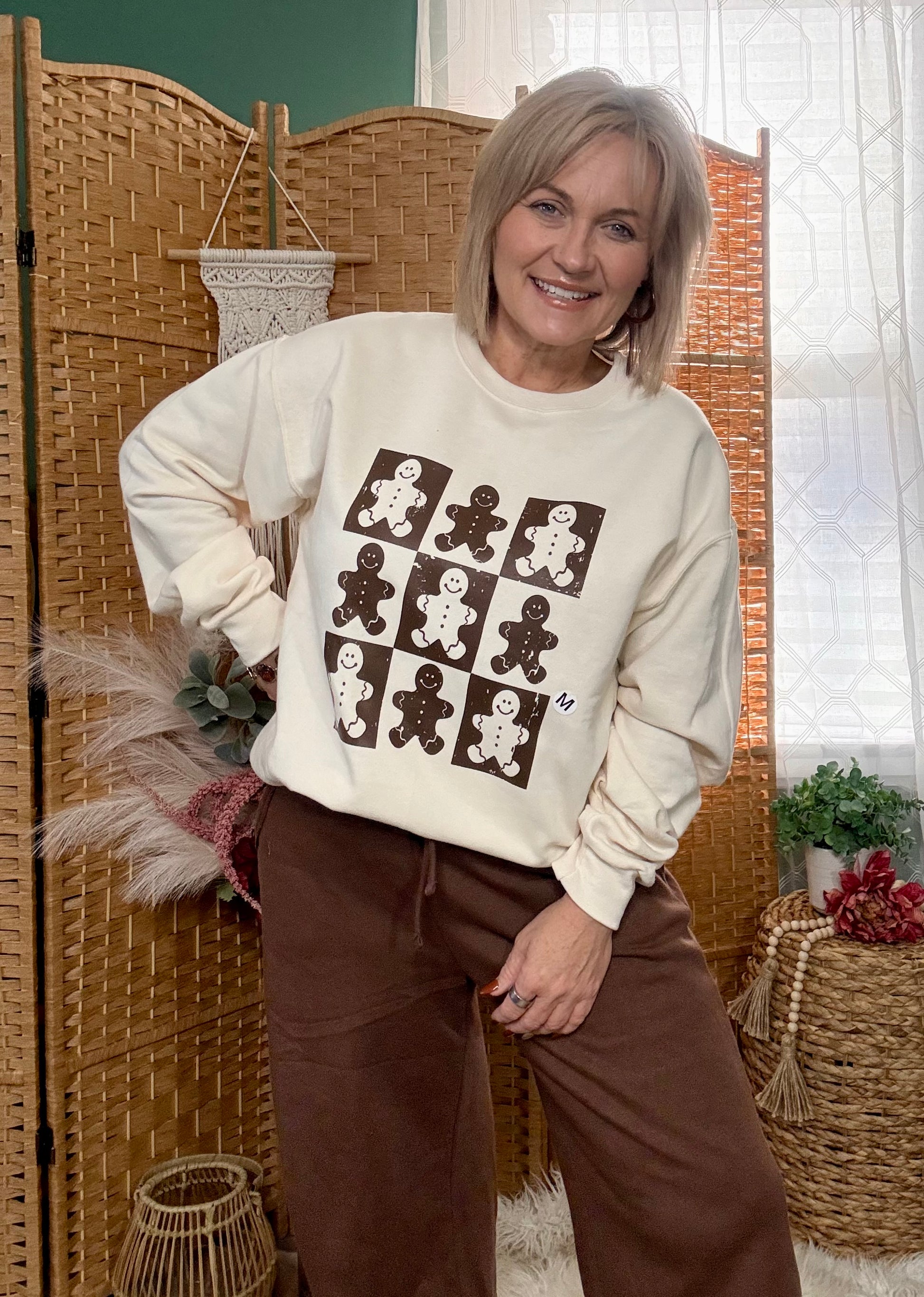 Get cozy in sweet seasonal style with our Ginger Snuggle Tile Sweatshirt! This fleece-lined, ultra-soft pullover is a winter dream in soft cream, featuring a charming heat transfer graphic of gingerbread men on chocolate-brown tile print. The premium-quality transfer feels like a smooth screen print — perfect for holiday baking days, sipping cocoa, or gift wrapping in comfort and cheer.