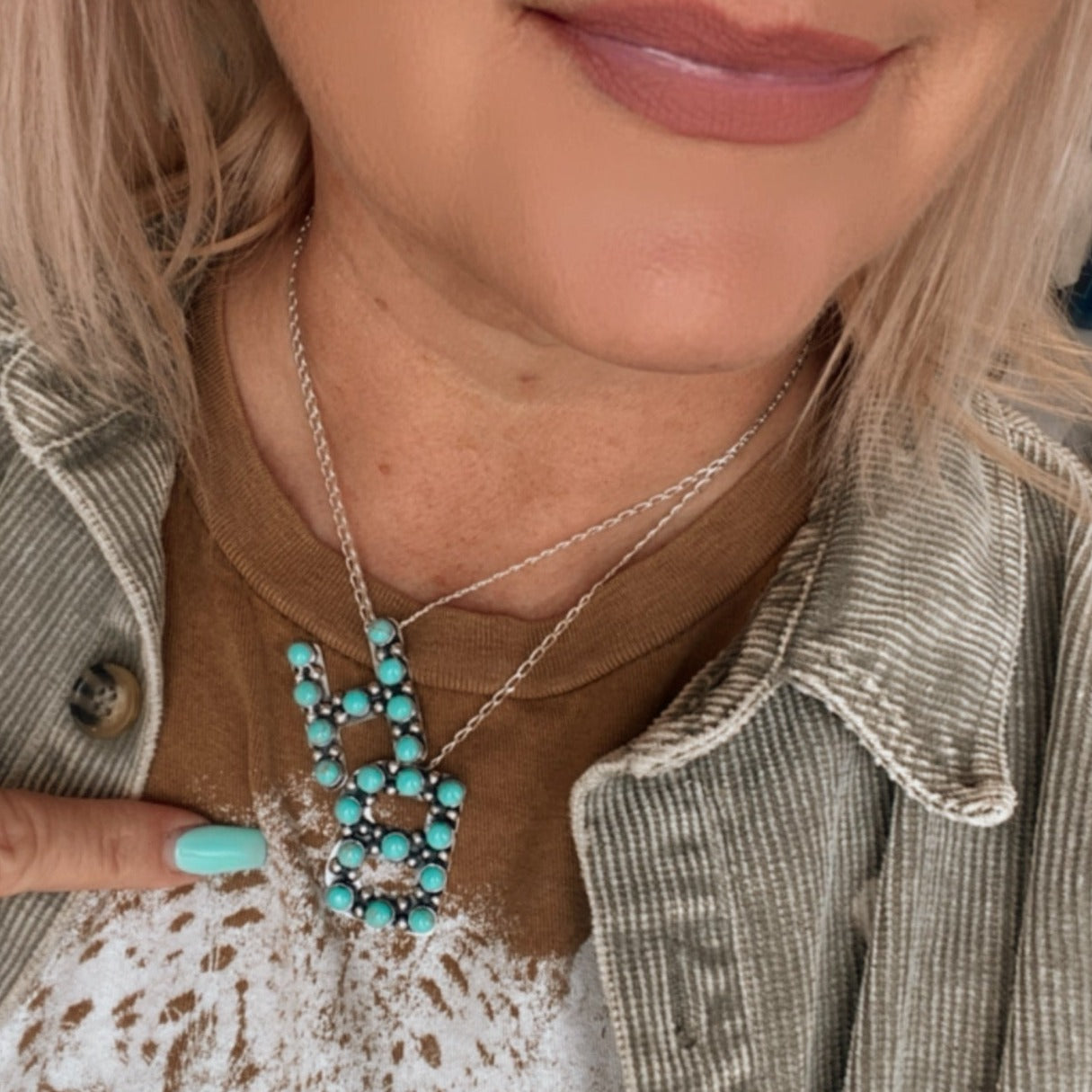 Sterling silver letter studded with turquoise stones, makes a great statement necklace. Letter measures 1-2" in size (depends on letter).