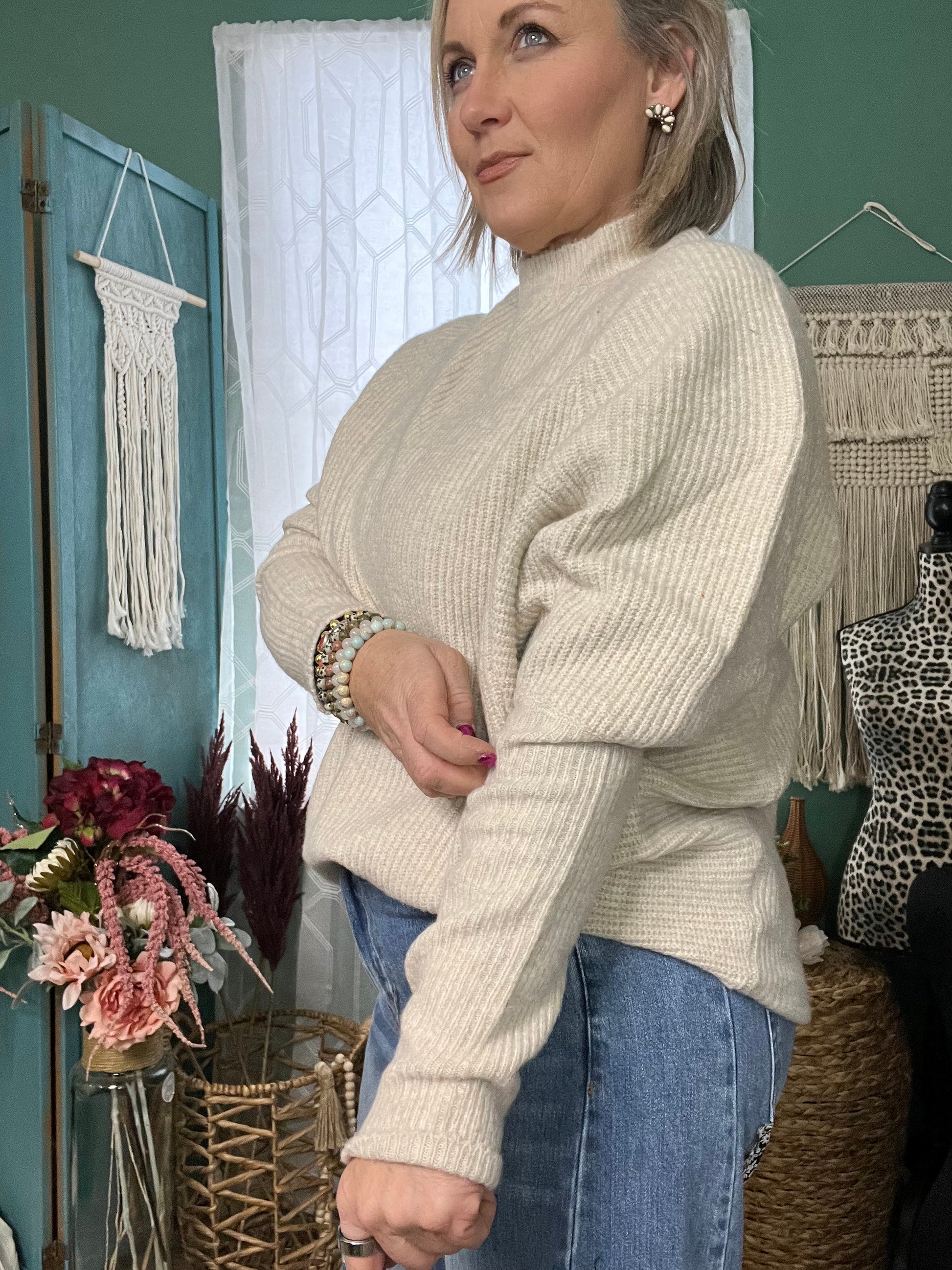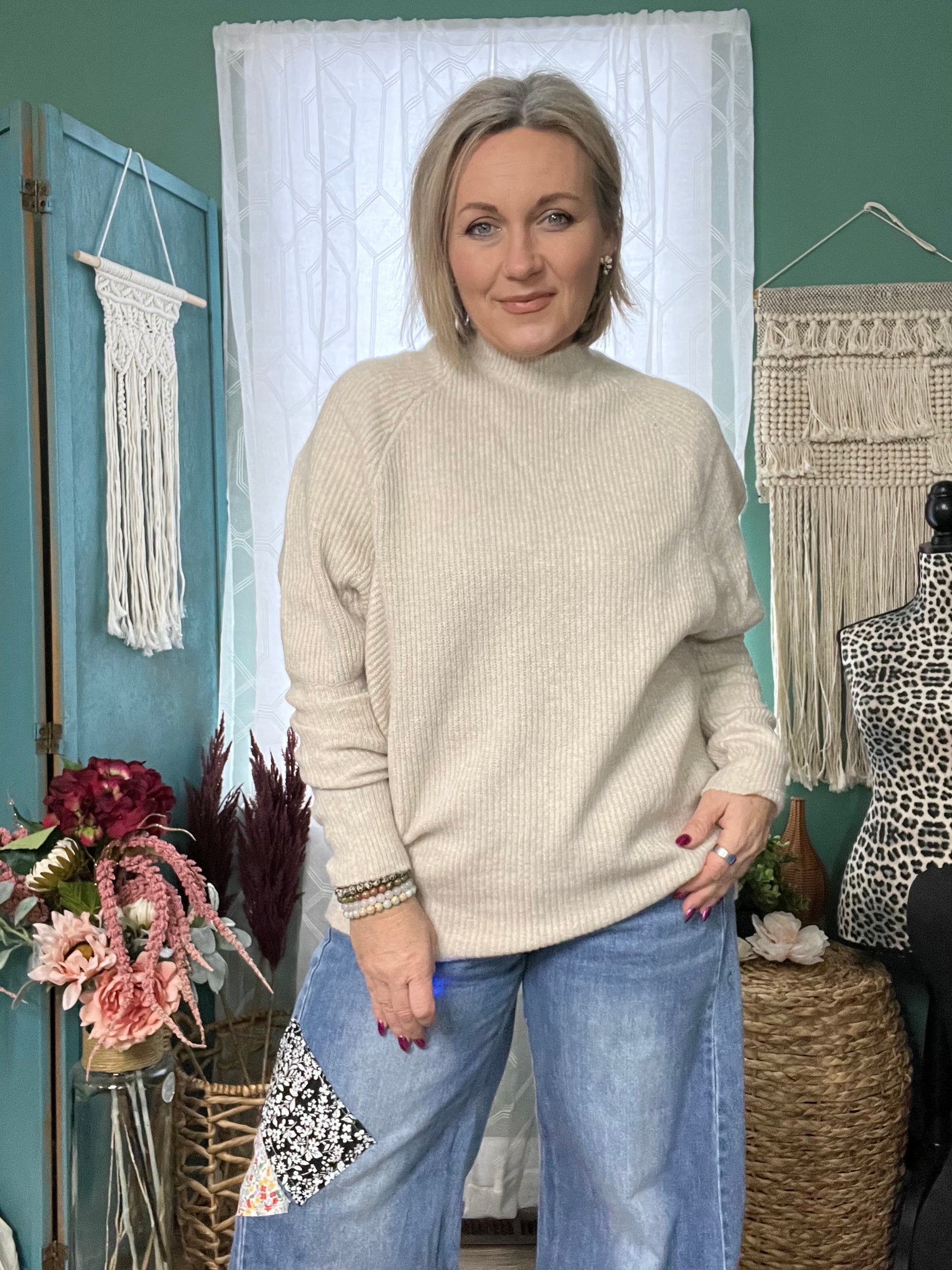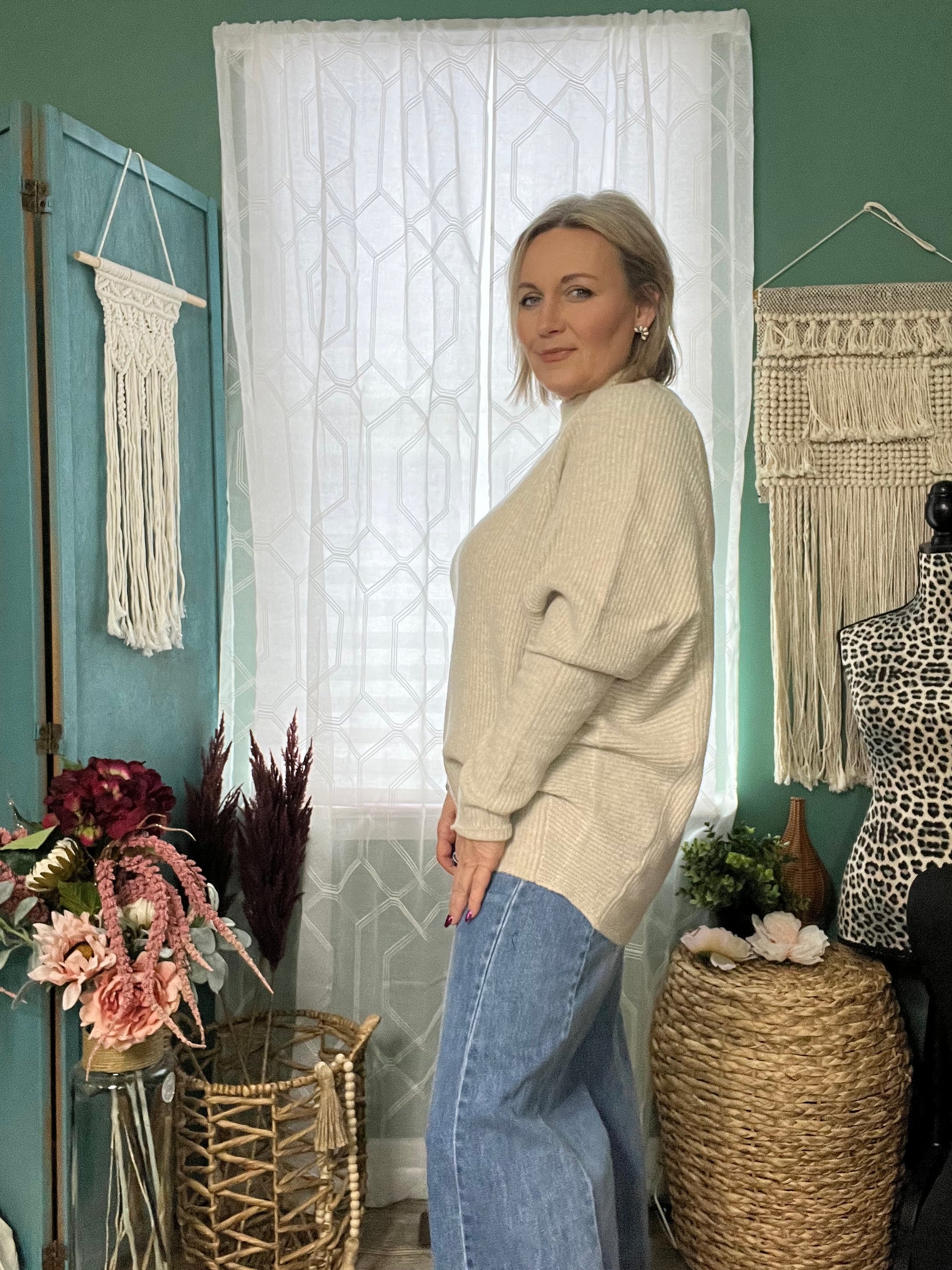 Stay cozy and chic in our Oatmeal long sleeve Dolman sweater.