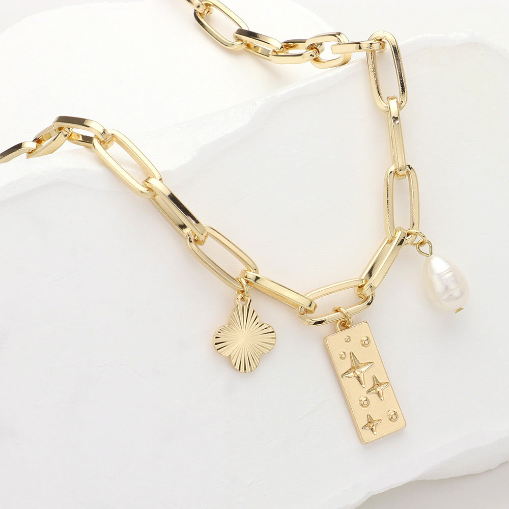 The perfect mix of charm and trend! The heavy link paperclip chain adds a touch of edge, while the celestial star tablet charm and pearl charm bring a touch of elegance. The adjustable length allows for versatility and the gold tone adds a chic finish. A must-have for any fashion-forward individual!