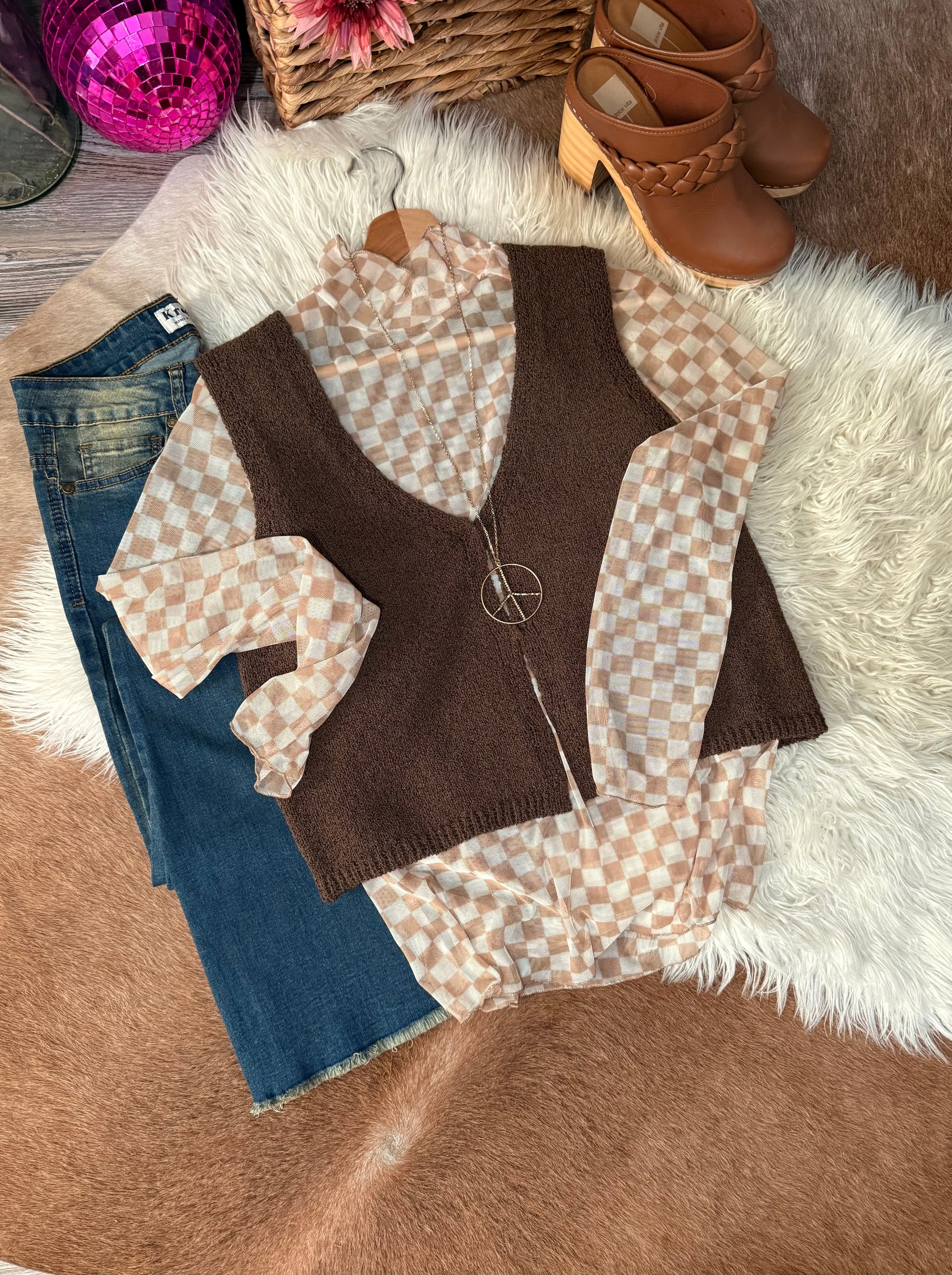 Perfect for layering over a fitted long sleeve, button-down, or even a dress—this brown sweater vest brings warmth and style to your transitional wardrobe. With its cropped length and close fit, it's just the right mix of trendy and timeless.