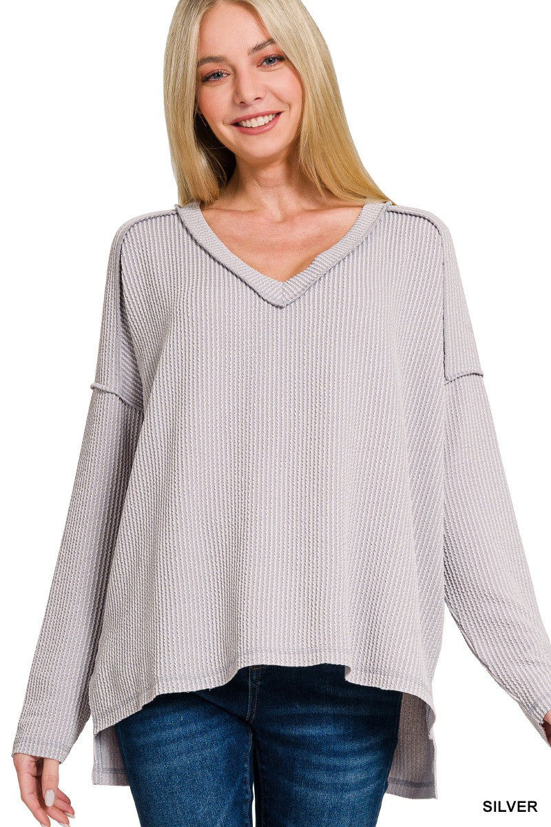 The long sleeves allow for comfort, while the drop shoulder and exposed seam add a stylish touch. The relaxed fit and urban ribbed texture make this top a casual yet fashionable choice. Perfect for everyday wear!