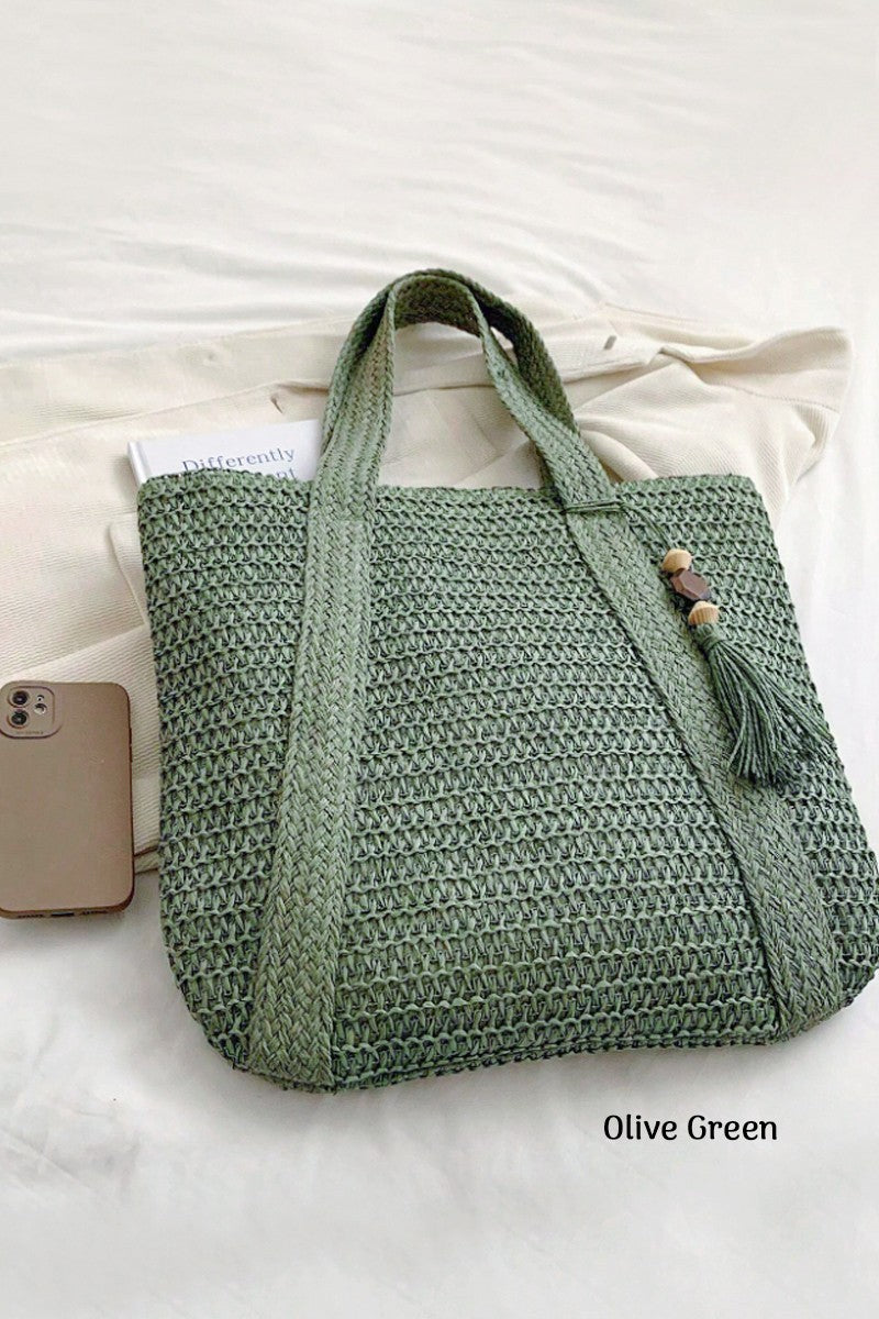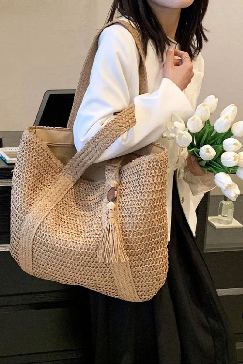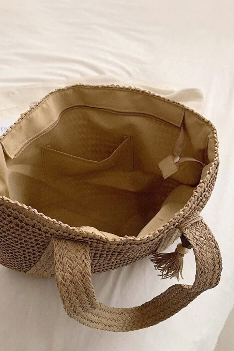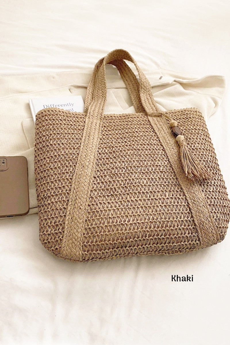 Durable Straw Material : Made from lightweight, reusable, and foldable straw material for convenience. - Anti-Theft Design : Features a zipper closure and slide pocket to keep belongings secure.