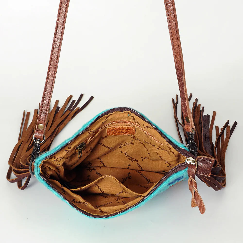 The crossbody bag is decorated with a beautiful leather fringe on each side giving it a western look.